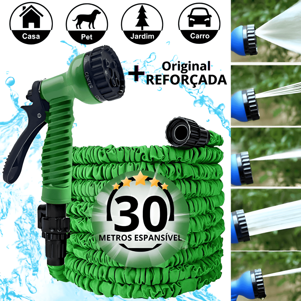 A Mangueira Mágica com Bico 7 em 1 - Magic Garden é diferente: ela se expande até 3x o tamanho ao encher e encolhe para caber em qualquer cantinho depois do uso.